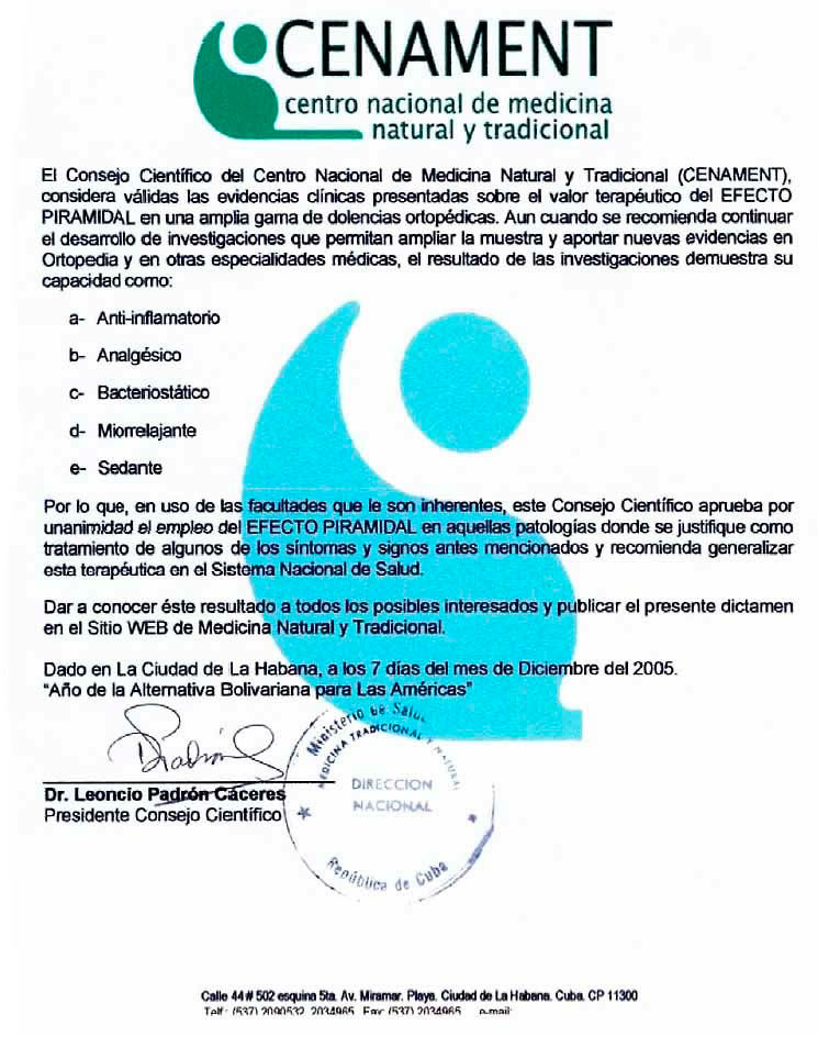 CENAMENT: El Consejo Científico del Centro Nacional de Medicina Natural y Tradicional, de La Habana, Cuba, considera válidas las evidencias clínicas presentadas sobre el valor terapéutico del EFECTO PIRAMIDAL.